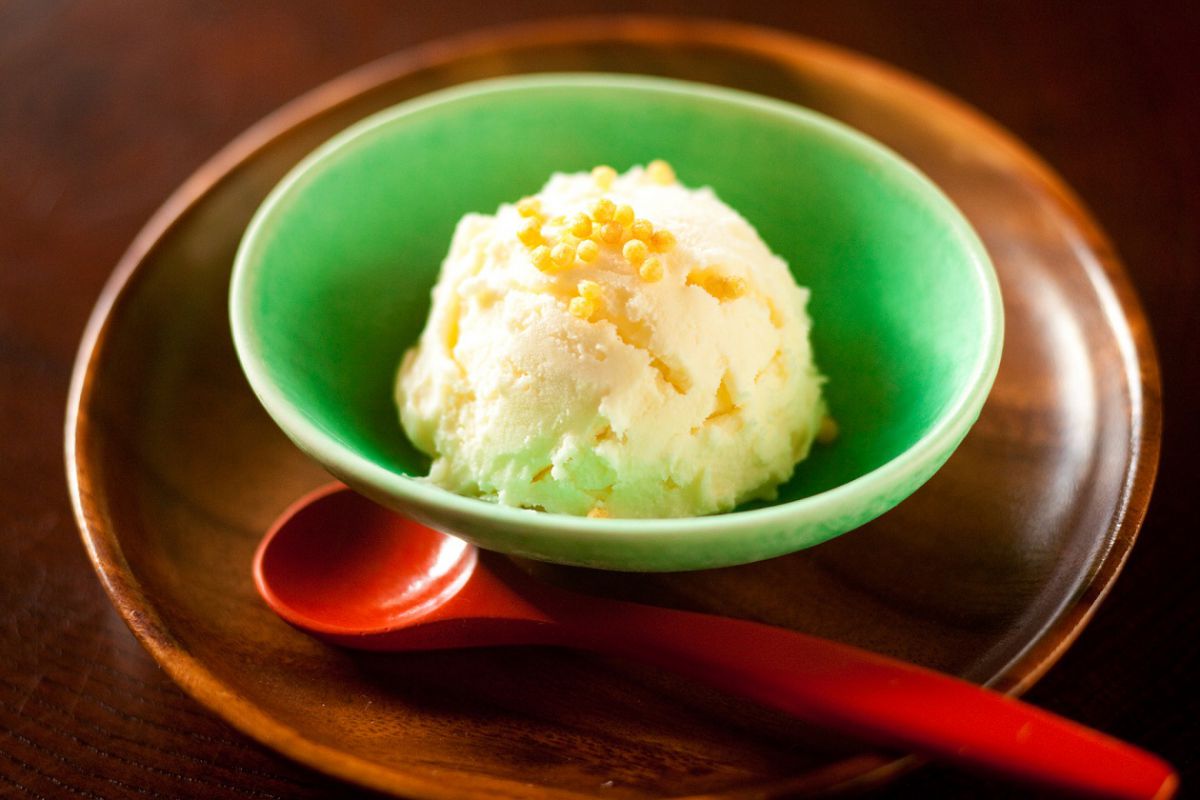 セットのデザートには「白味噌アイス」をチョイス。「煎り番茶のアイス」、「つぶあんと栗の茶巾しぼり」など5種類から選べます。500円プラスすると、デザートを3品盛りに変更することもできますよ。