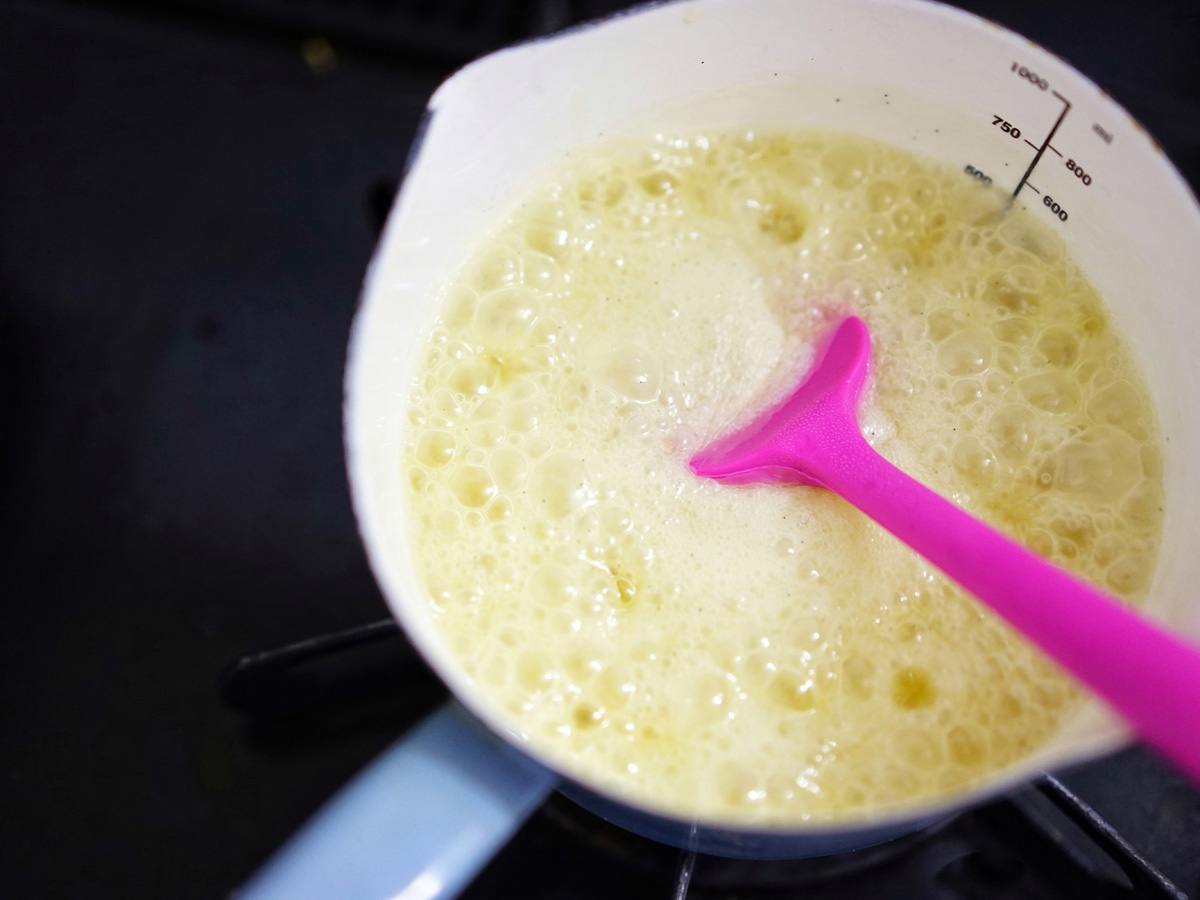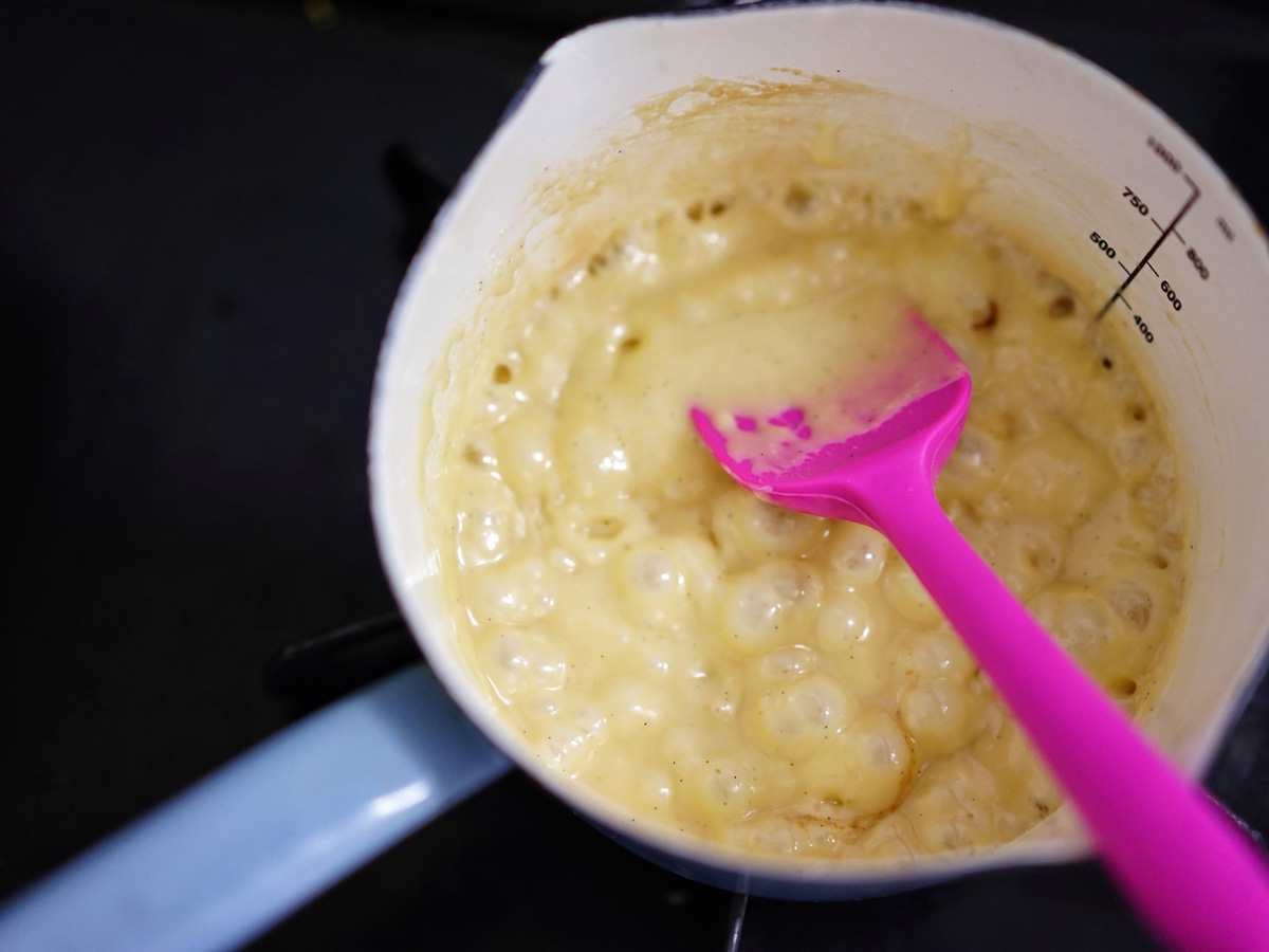 鍋に生クリーム、グラニュー糖、みずあめ、バニラビーンズ、バターを入れ、強火にかけて砂糖とバターを溶かします。大きな泡が出てくるまで、よく混ぜながらあたためて。