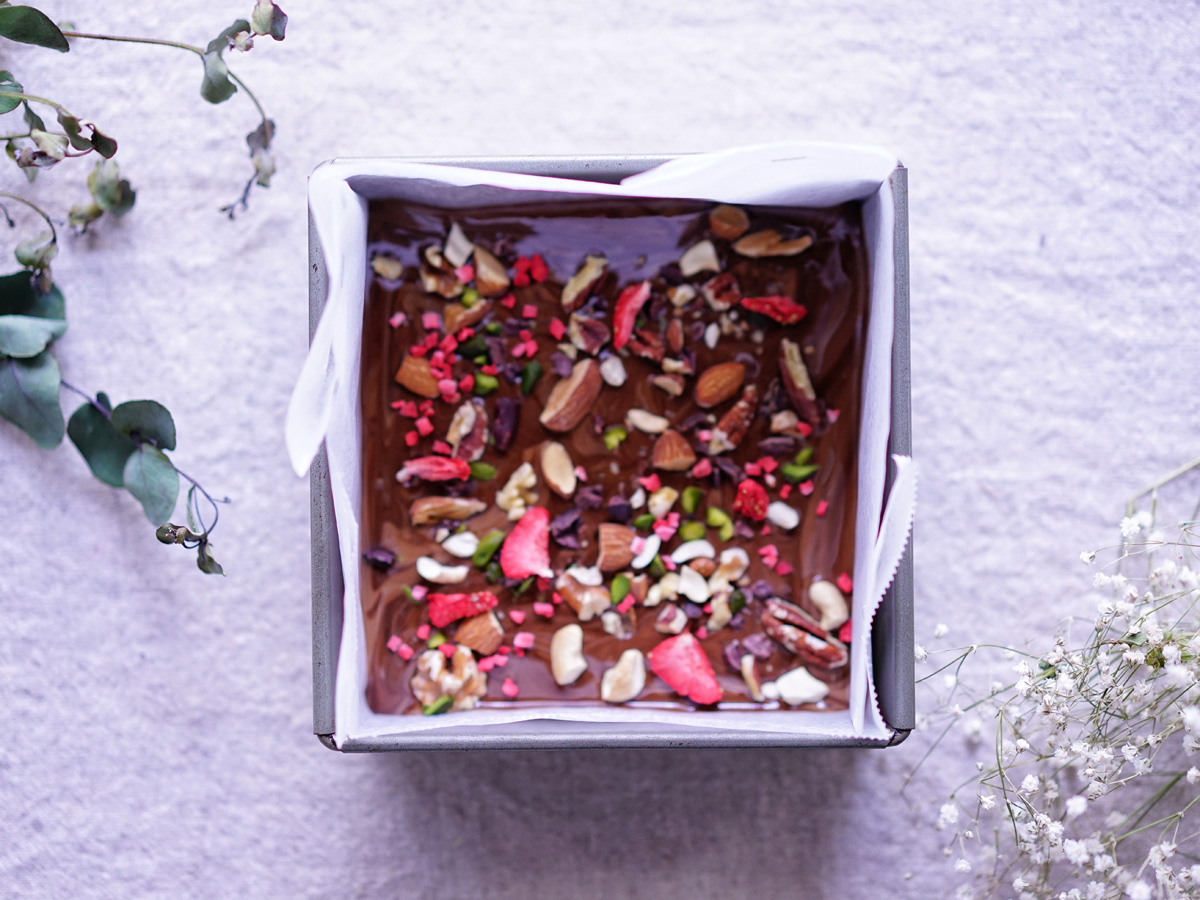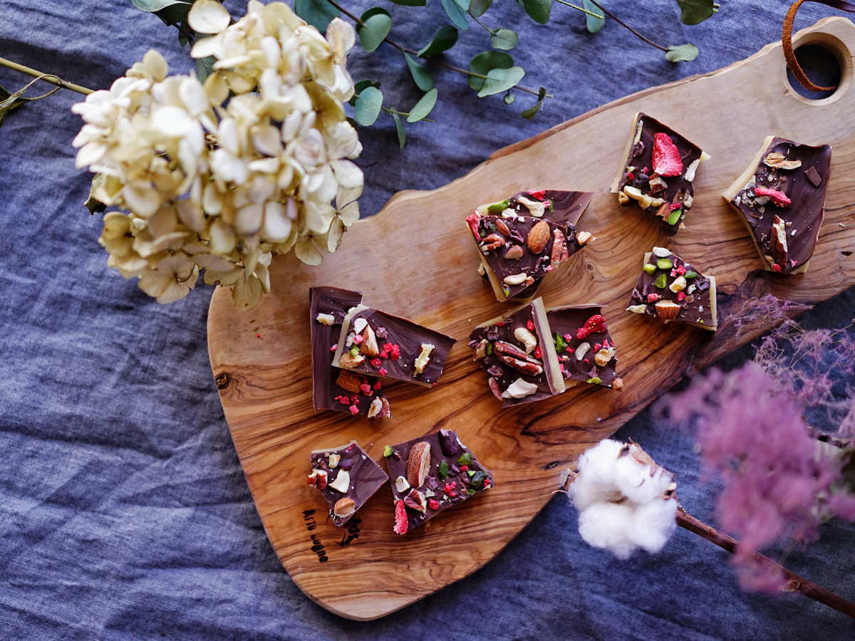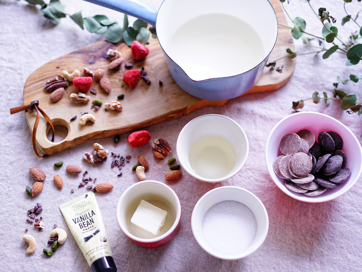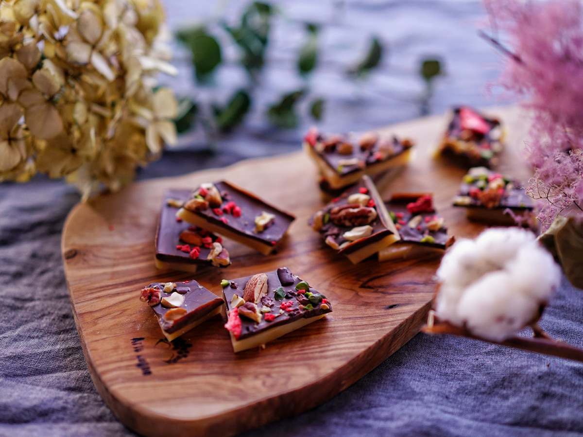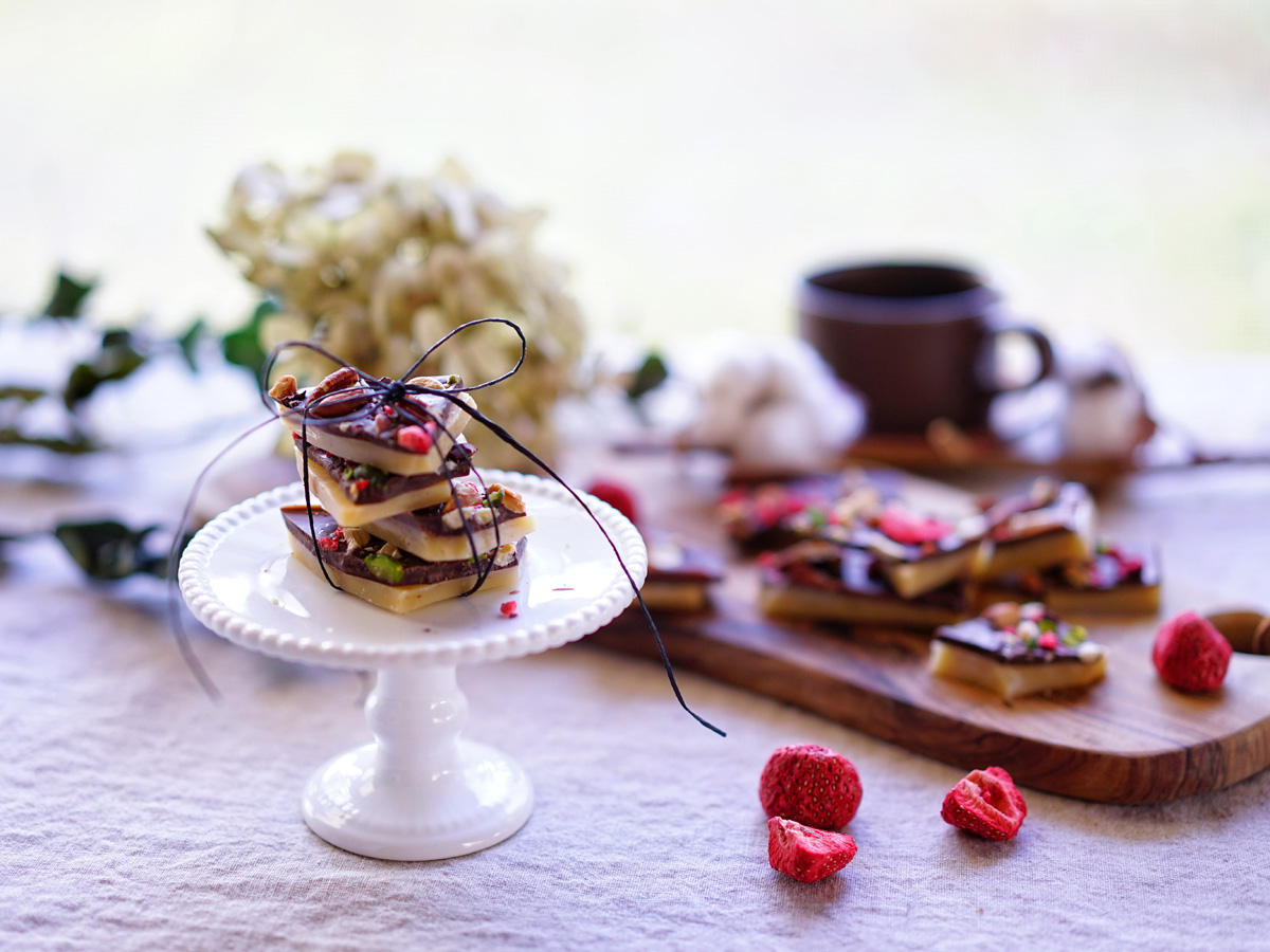 タフィーの表面が固まったら、湯煎で溶かしたチョコレートを流し入れます。刻んだナッツやフランボワーズなど、お好きな食材をトッピングして、華やかに。カカオ豆を焙煎して細かく砕いたカカオニブを入れると、苦みと香りがアクセントになります。