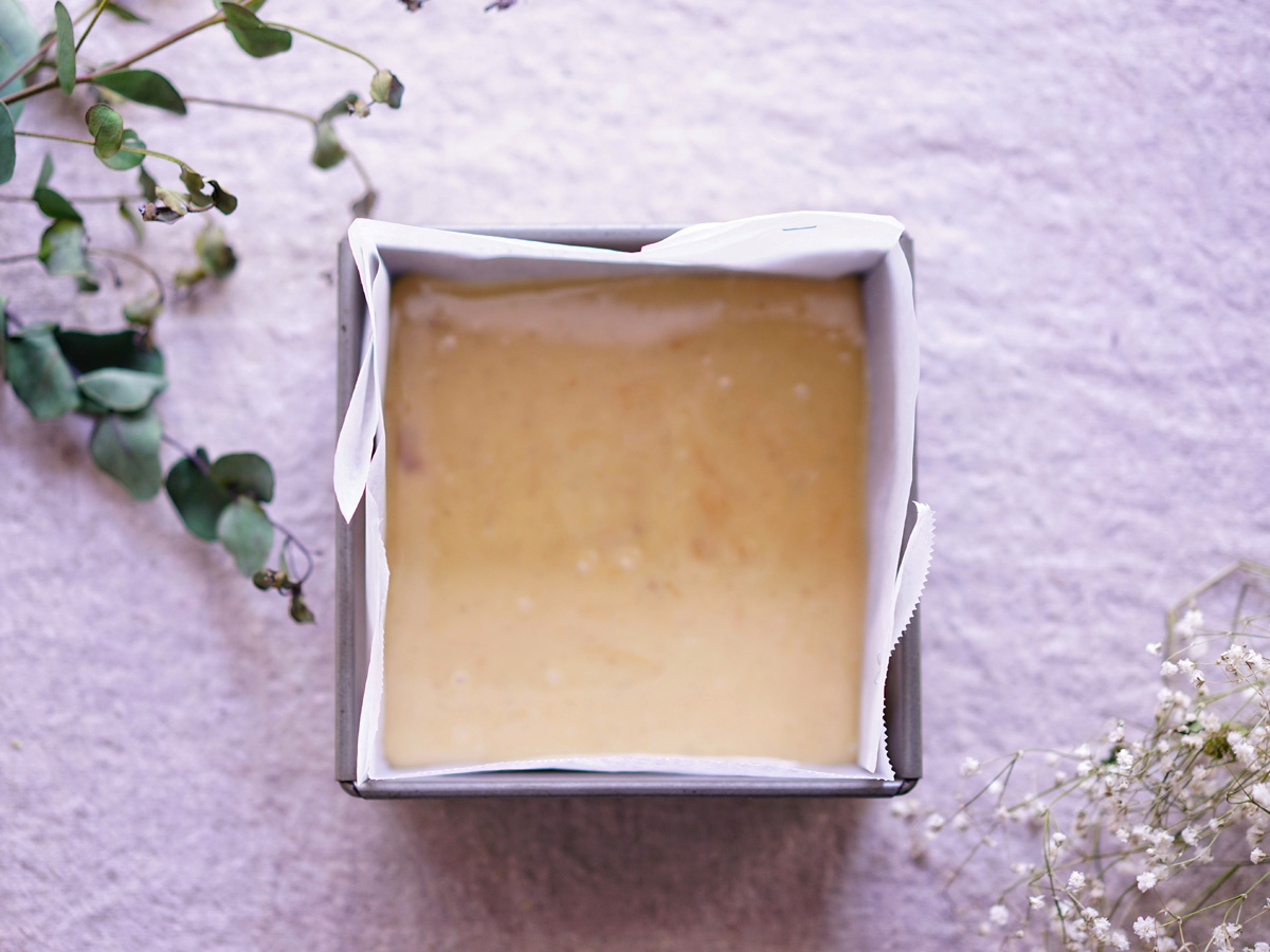 オーブンシートを敷いた角形に流し込んで、固めます。角形がご自宅にない場合は、オーブンシートを折って、4隅をホッチキスで留めた自作の型でも大丈夫です。