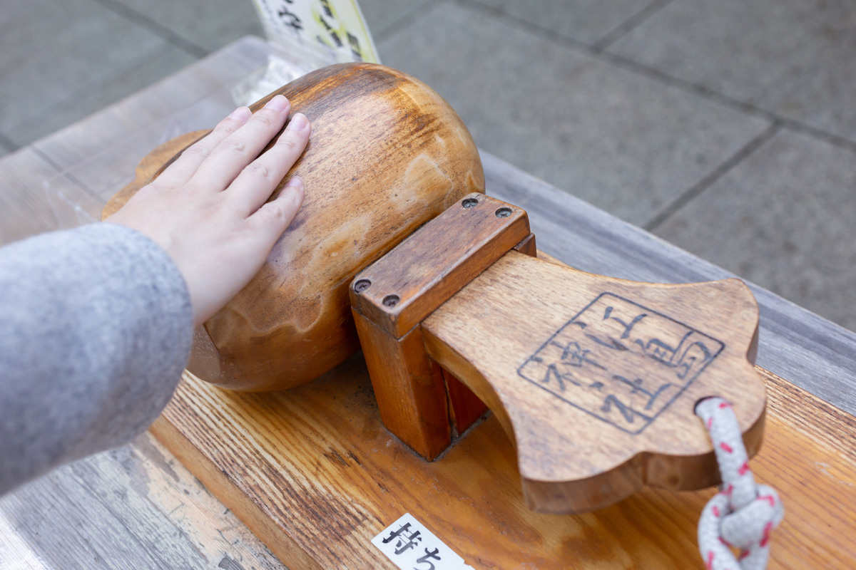 本殿のすぐ目の前には「打ち出の小槌」があります。こちらは、3回撫でながら願い事をすれば、その願いが叶うといわれていますよ!