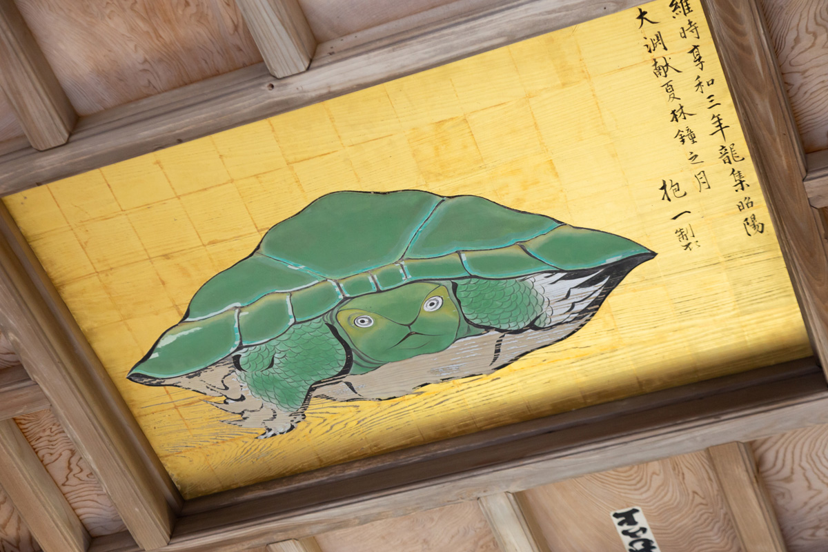 奥津宮の拝殿天井を見上げてみると、「八方睨みの亀」が描かれています。どの方角からみてもこちらを睨んでいるように見えるので、いろいろな所から眺めてみて。