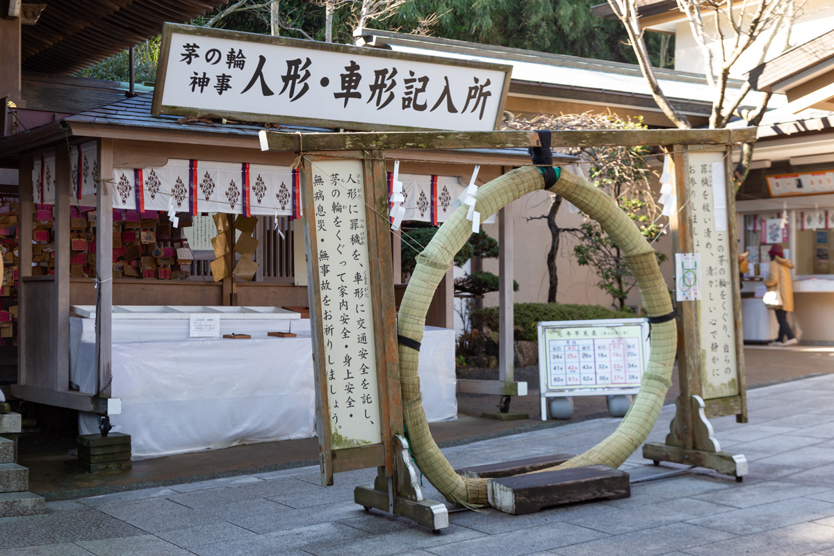 本殿への参拝の後は、「辺津宮」にあるたくさんのご利益スポットをめぐりましょう。まずは「茅の輪」。看板に記されたくぐり方を参考に正しくくぐれば、ご利益が得られるそうですよ。