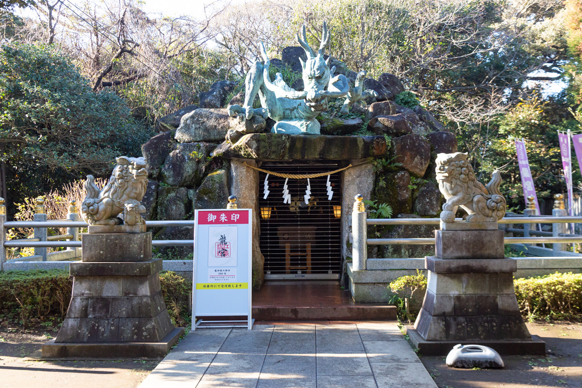 奥津宮の隣にあるのが安産・子宝のご利益があるという「龍宮(わだつみのみや)」。江の島弁財天信仰の発祥の地である岩屋本宮の真上に位置していて、北条時政などもここで子孫繁栄を祈願したといわれています。