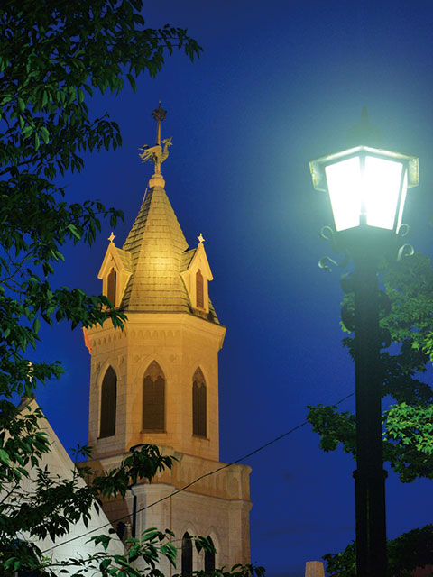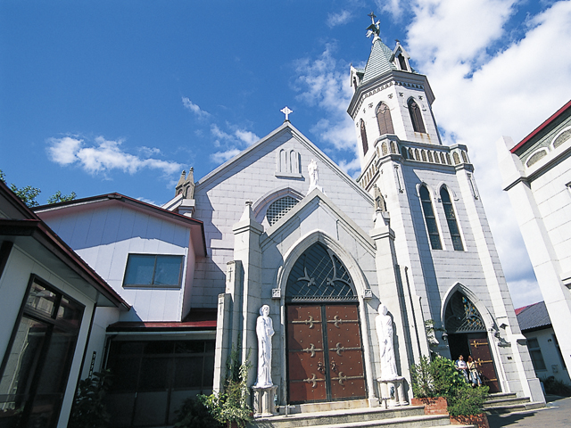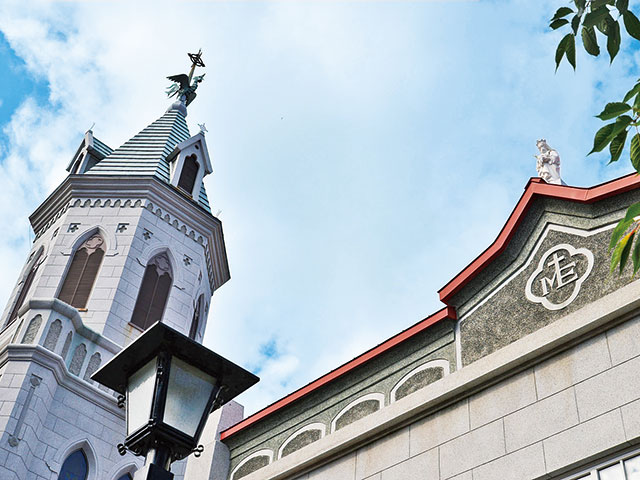 美しい西洋建築の教会が立ち並ぶ元町のなかでも代表的な教会のひとつ。12世紀のゴシック建築様式を用いた、高くそびえるとがった屋根の大鐘楼が特徴です。大聖堂内の祭壇はローマ法王から贈られたもので見ごたえたっぷり。ライトアップされた幻想的な夜の姿も見逃せません。