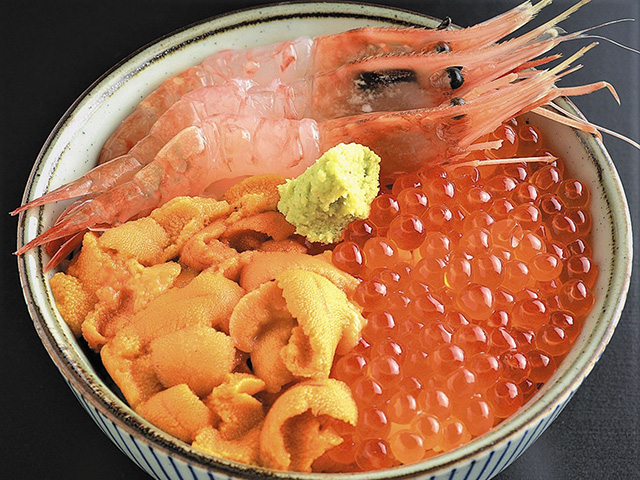 函館市民の台所として古くから親しまれている函館朝市の一角にある食堂。大漁旗が掲げられた活気あふれる店内で鮮度抜群の海の幸を堪能できます。ウニやいくら、サーモンなどからネタが選べる5色海鮮丼をリーズナブルにいただけるのが魅力です。オリジナルの海鮮丼を食べたら街歩きをスタート!