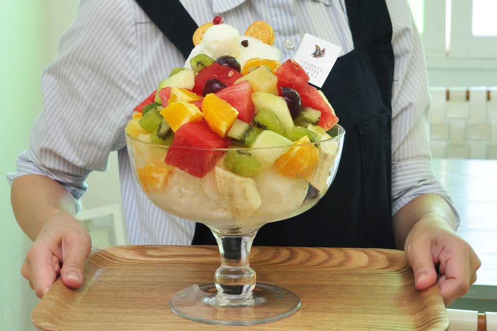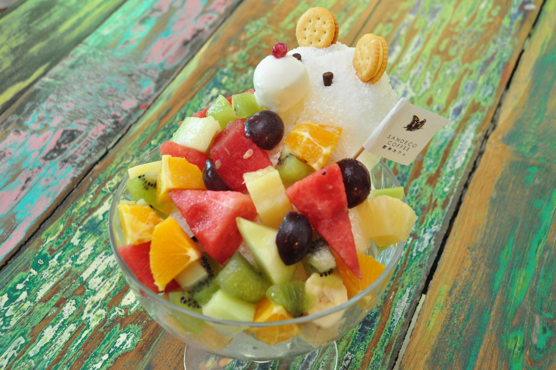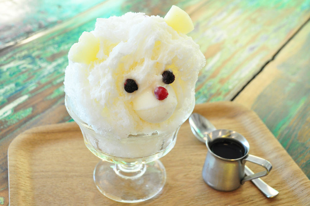鹿児島の名物スイーツとして知られる「白熊」は、練乳やフルーツを使ったご当地名物のかき氷。「SANDECO COFFEE数学カフェ」の白熊は、つぶらな瞳がたまらなくかわいくて、食べるのをためらってしまうほど!かわいい顔ながら、シロップにもこだわりアリの“進化系”白熊なんです。