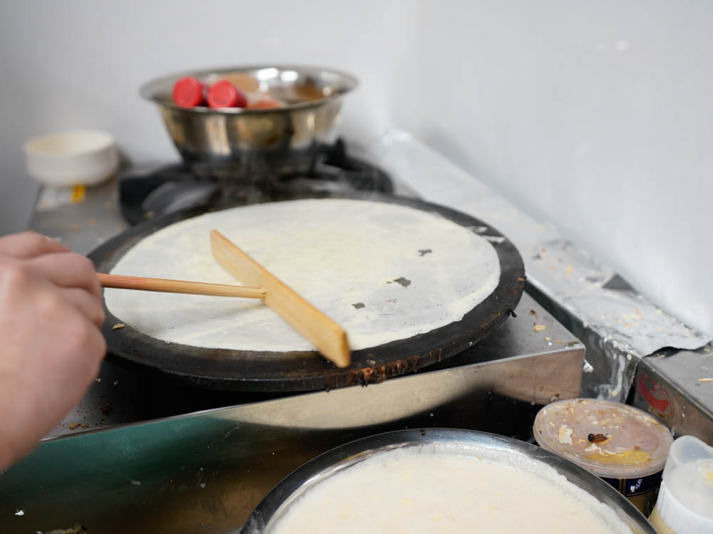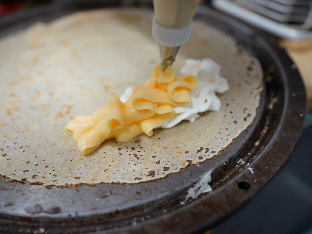 「よくSNSに載せられてるお客様は、3倍を頼まれますよ!」とのことで、お店おすすめの「いちご3倍・カスタード生クリームハーフ」(880円)を注文。注文が入ってから、店主さんが一枚一枚丁寧に生地を焼いていきます。