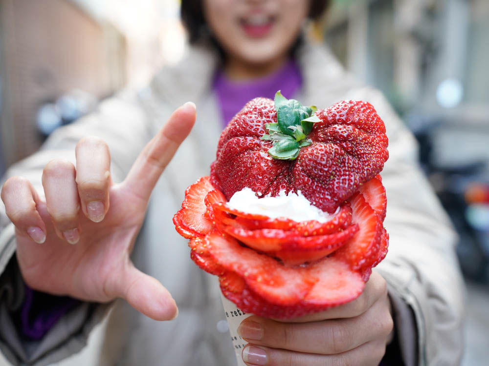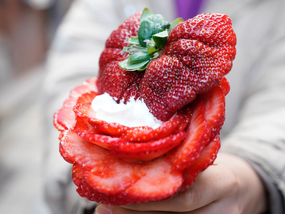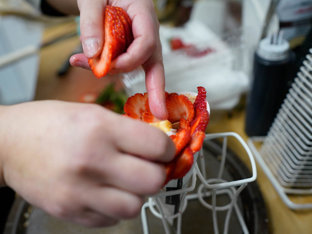 できあがった生地に2種類のクリームといちごを乗せ、巻き上げたあとにもさらにクリームを絞り、いちごが綺麗に並べられていきます。このブーケのようなクレープは、お客さんの「花束みたいに作ってほしい」という要望を受けて作ったのが始まりなのだとか。