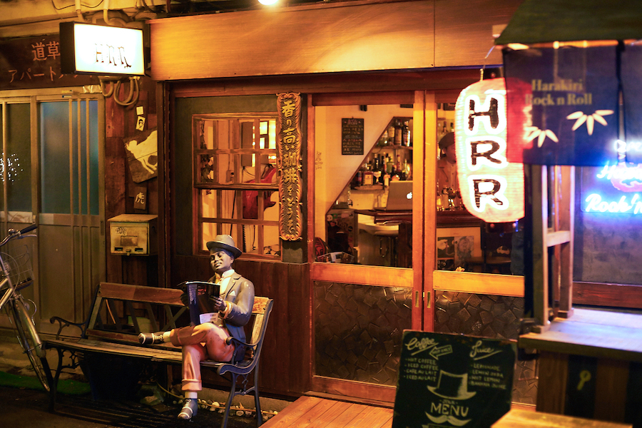 ラストは店先のベンチに座る男性の銅像が印象的な、「cafe&bar HRR(ハラキリロックンロール)」へ。作曲家やDJとして活躍する傍ら、音楽を通して人と人を繋ぐ場所を作りたいとオープンしたこちら。種類豊富なお酒はもちろん、冬場はおでんなどのおつまみも楽しめます。