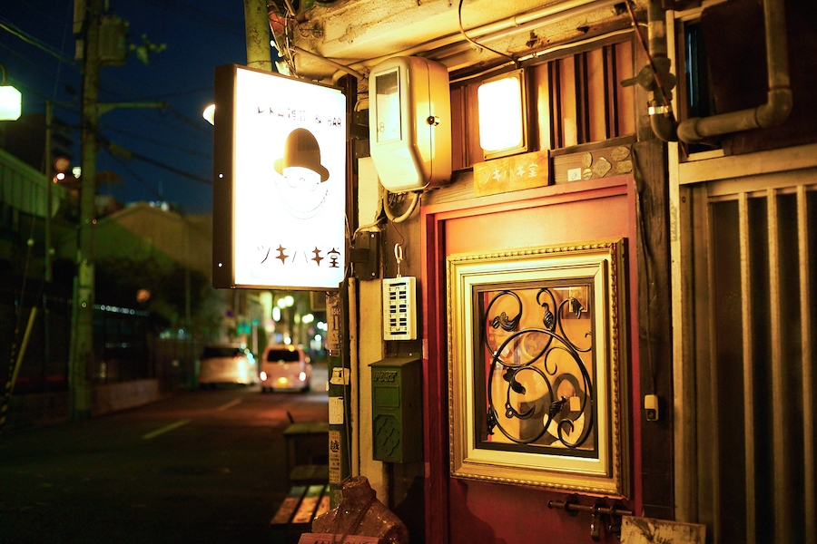 夜の闇に包まれ、そろそろ辺りに灯りがともり始めました。お次は真っ赤なドアが目印の雑貨バー「ツギハギ堂」へ。