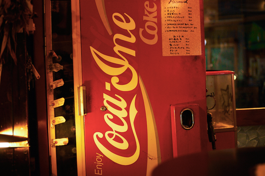 誰もが知る某有名飲料をパロディした、ハンドペイントの冷蔵庫。遊び心溢れる空間に思わずワクワク。