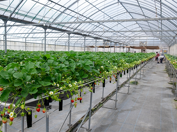 イチゴの花言葉でもある「幸せな家族」がお店のコンセプトで、ハウスの中も家族みんながイチゴ狩りを楽しめるように工夫されています。通路は双子のベビーカーや車いすが通れるほど広々。イチゴの果実や葉っぱが服やカバンなどに当たらないため、イチゴ狩りに専念できますよ。