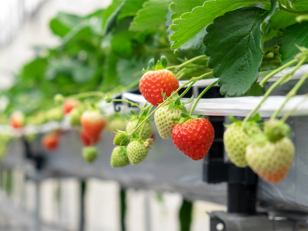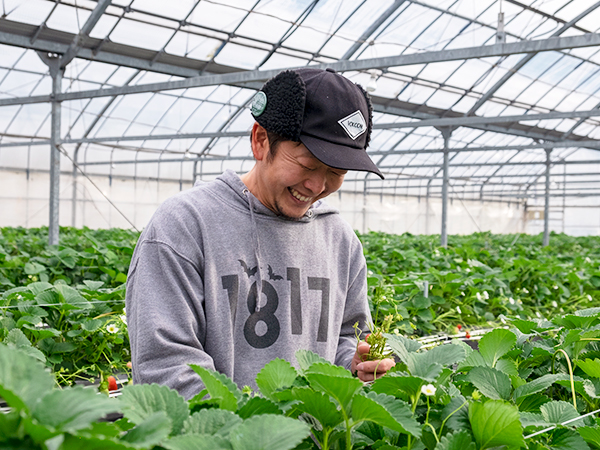 カフェ「いちご日和」から歩いて1分の場所にあるイチゴハウスでは、1~5月までイチゴ狩りが楽しめます(予約制、90分間、大人1,500円、小学生1,300円、2歳~1,000円、~1歳無料)。おいしいイチゴを安定して提供するため、イチゴ狩りの受け入れは少人数制。イチゴの品種は「紅ほっぺ」と「かおりの」の2種類です。