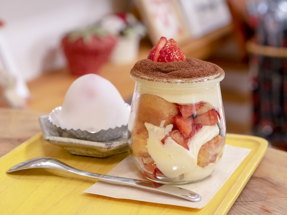一番食べて欲しいのは「いちごティラミス」400円。トロリとしたクリームと甘酸っぱい生イチゴが絶妙なバランスで絡み合って、ぜいたくな味わいです。ガラスの容器に入っていて、見た目もおしゃれ。