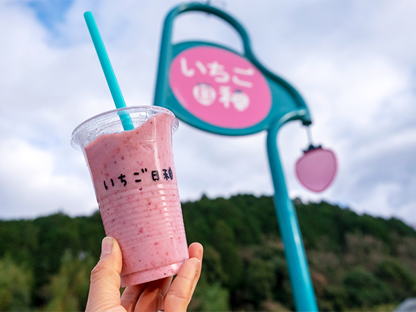 「いちごシェイク」をはじめとしたスイーツは持ち帰りOK。ハウス横の駐車場と、店舗前にある看板が人気の撮影ポイントで、テイクアウト用のカップを掲げて写真を撮るのが定番です。