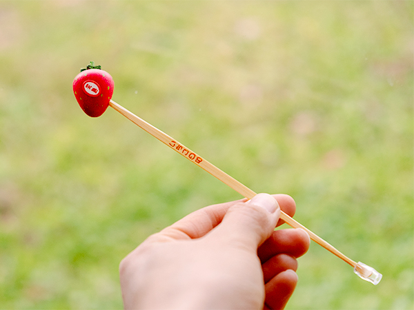 カントリー調のかわいい店内では、「いちご日和」特製グッズも販売。木の家具や雑貨を手掛ける地元メーカー「大五木材」とのコラボ商品「熟いちご耳かき」330円や「完熟いちごキーホルダー」380円など、素朴でキュートなイチゴモチーフのグッズが並んでいます。ぜひ手に取ってみてください。