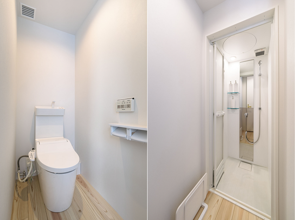 フロアごとに設置されたシャワールームやトイレ、洗面スペースは白で統一され、シンプルなつくり。パジャマブランド「Nells(ネルズ)」とコラボしたパジャマの販売はありますが、アメニティ類の販売はないので要注意です。使い慣れたものを持参して。
