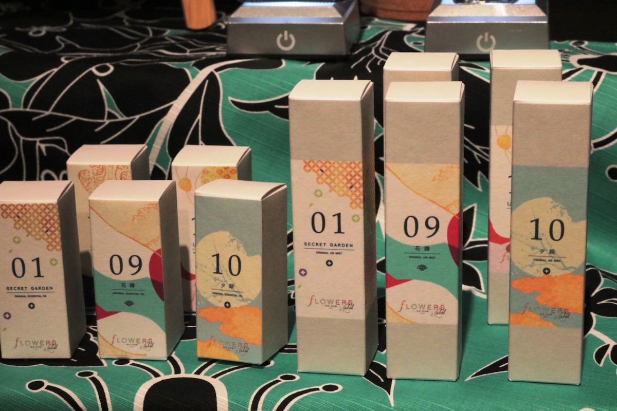 こちらは、会場の作品を演出している香り「オリジナルアロマミスト(5種)」と「オリジナルアロマオイル(5種)」を販売。各1800円。