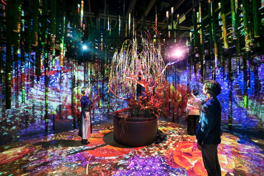 竹に耳をあてると中から音が聞こえてくる「竹林の風音(ちくりんのかざね)」を通ると、その先はいけばな草月流との先進技術の新作コラボ「茶室―調心の間―」。その場に居合わせた人の呼吸や心拍を感じ取り、息が合い、心がひとつになることでこの空間は完成されます。静かに立ち、音、香り、光に感覚を研ぎ澄まして見事な調和を感じ取ってみて。