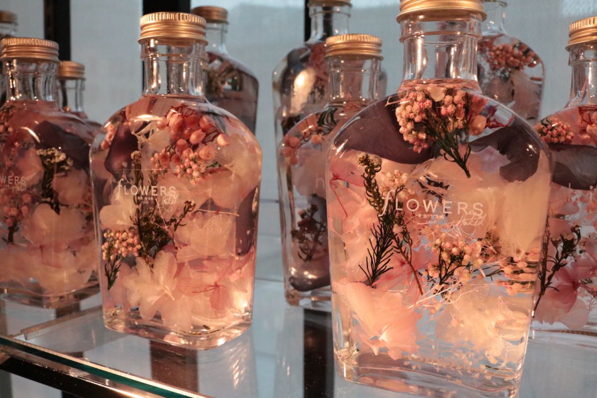 『FLOWERS BY NAKED』の世界を瓶のなかに閉じ込めた「オリジナルハーバリウム(2種)」2500円は、ブランド『hikka』とのコラボ商品。このほか、オリジナルポストカードや、風呂敷、ハンカチなど会場でしか買えないグッズをお見逃しなく。