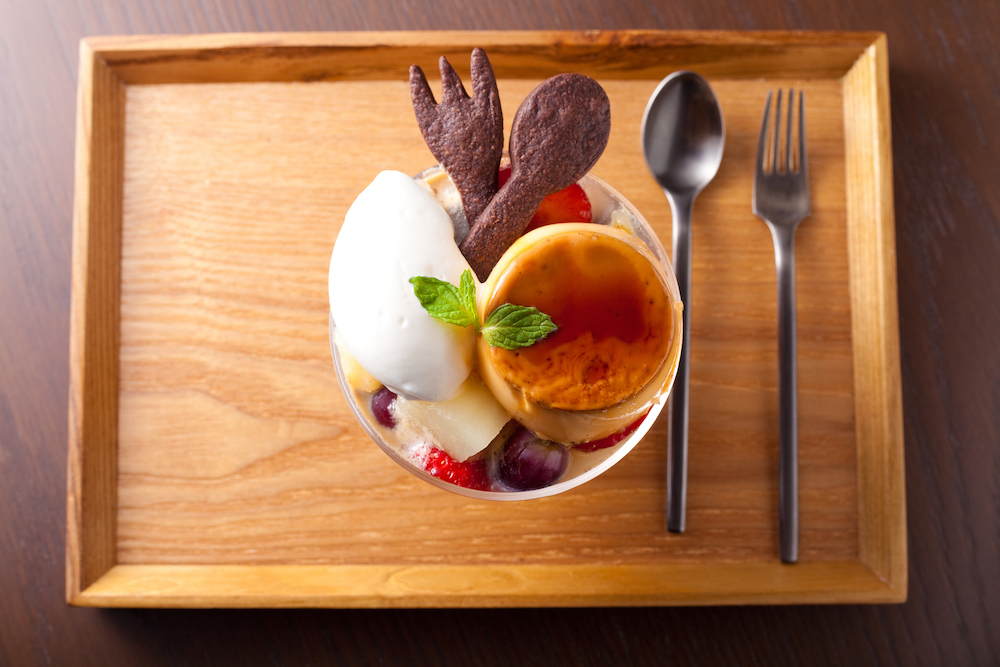 最近のカフェではあまり見かけなくなったフルーツポンチを発見!しゅわしゅわのソーダに季節のフルーツをたっぷり入れて、上に自家製カスタードプリンをのせたレトロかわいい一品。