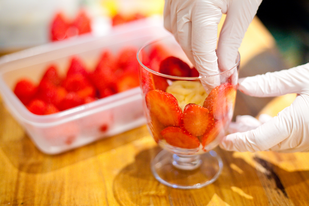 さて、人気の「いちごやま」の製作工程を間近で見せていただきました!ブランドいちご「あまおう」の断面が見えるようにグラスにびっしりと並べ、自家製のカスタードと、こちらも自家製のジェノワーズ(ケーキ生地)を土台にして、グラスのふちギリギリまでいちごを盛っていきます。