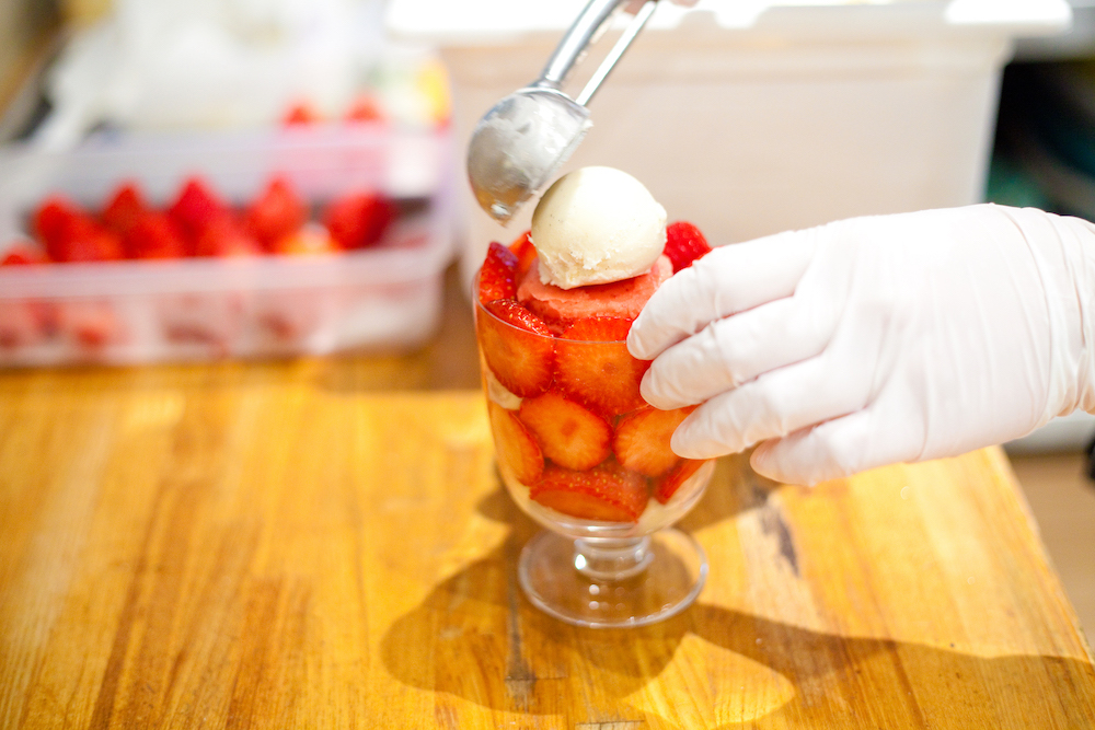 「2、3月になると、いちごの糖度が上がっていくので、アイスやシャーベットの甘さを控えていきます」と店長さん。そんな細かな味の調整ができるのは、すべてが自家製だから。バニラエスプーマなど、乳脂肪分は極力控えたり、キュッと酸っぱいライムジュレで味を引き締めたり。