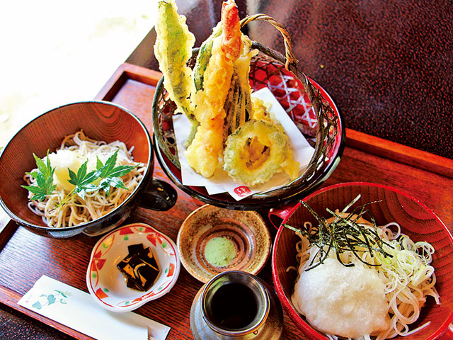 毎朝用意する打ちたての白蕎麦と、旬の加賀野菜を使った天ぷらが絶品!一番人気は、おろし蕎麦&とろろ蕎麦、それに天ぷらがセットになった「ふたみそば(1500円税別)」。2つの味を食べ比べるのが楽しい一品です。数がなくなり次第営業終了なので、のんびりはしていられませんよ!