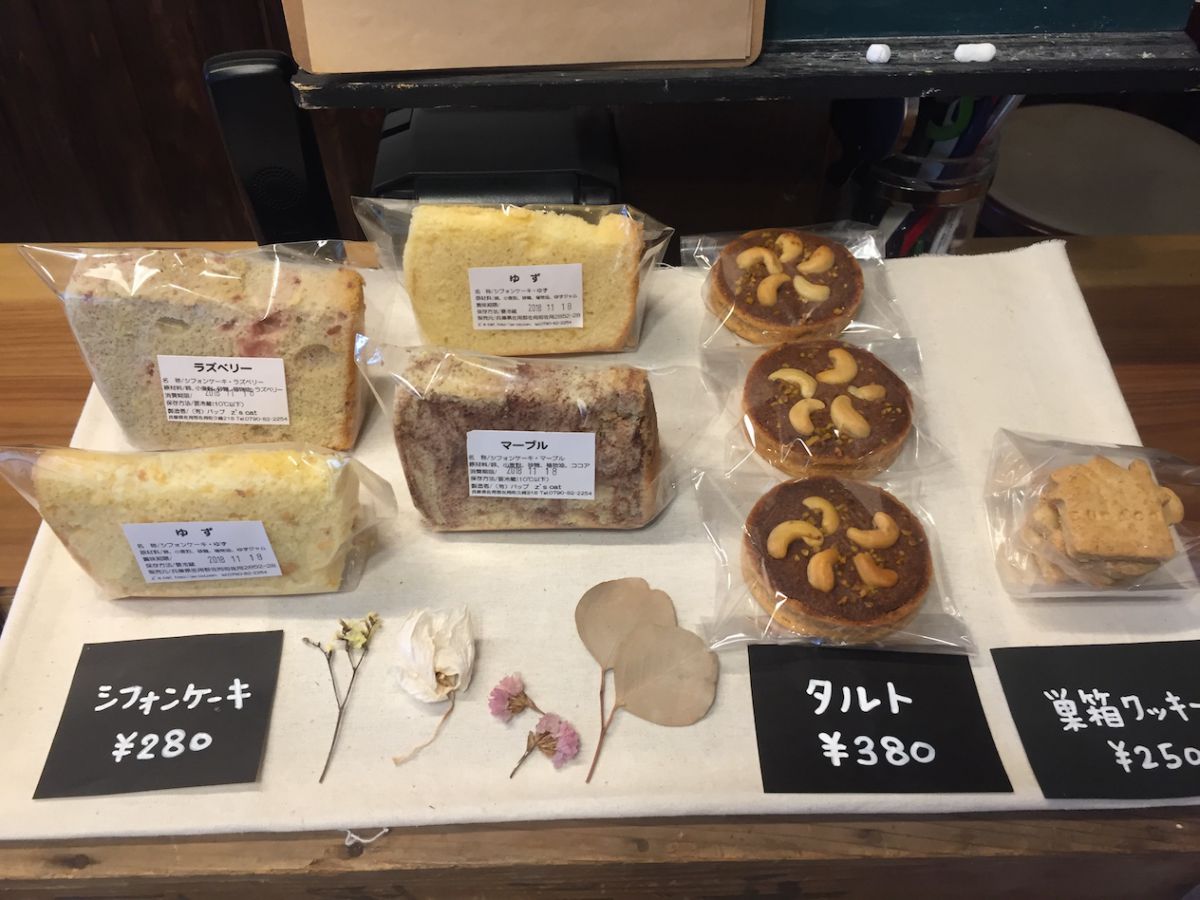 焼き菓子はテイクアウトもOK。3種のシフォンケーキのほか、「巣箱」さんが作るタルトやクッキー(5枚入 250円)などが並びます。どれも甘さ控えめで、やさしい味わい。