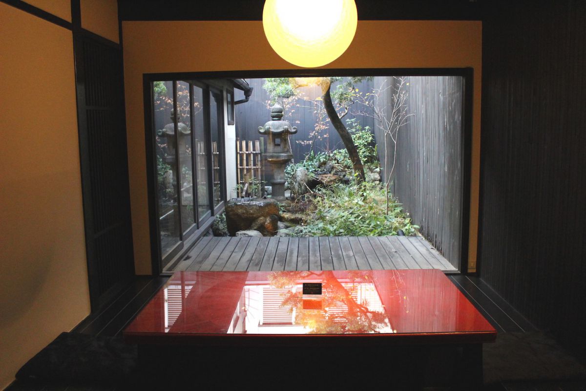 坪庭に一番近い奥のテーブル席は、4名以上で利用が可能。赤い漆塗りのテーブルは、世界的にも活躍する漆工芸作家、村田好謙さんの作品でとても貴重なものだそう。予約もできるので、グループで利用する場合は事前に連絡をいれるのがおすすめです。