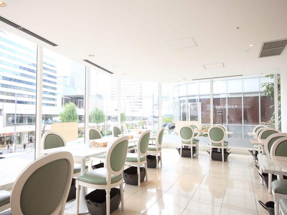 白を基調とした店内はテーブル席のほかソファ席もあり、大きなガラス窓からは、目の前を通る外堀通りを見下ろすことができますよ。