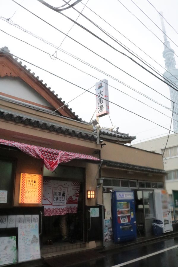 押上駅から歩いて5分ほど、街中に立つ銭湯「大黒湯」。ここが『銭湯くまモン』の会場です。この日は残念ながら雨模様でしたが、それでもスカイツリーが間近に見えました。