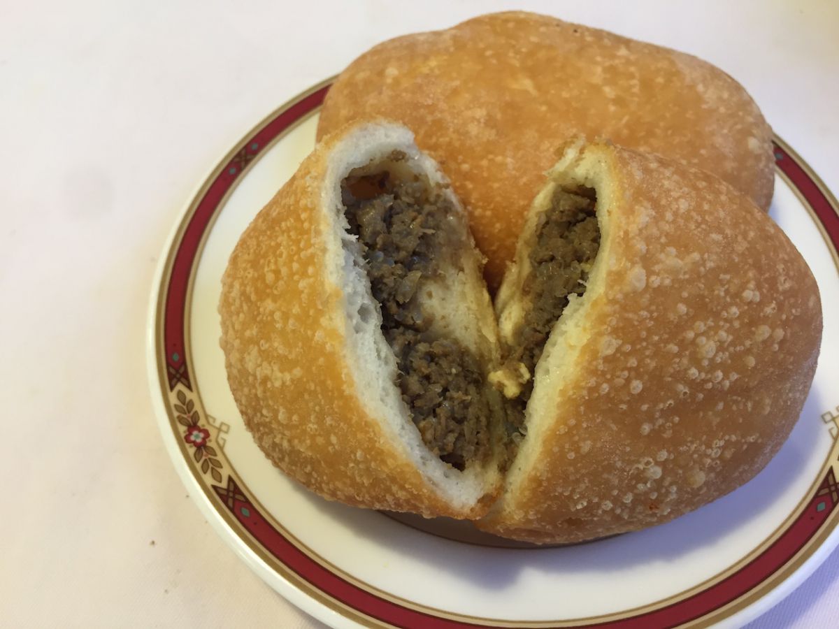 また、大きな俵型の「ピロシキ」は、大豆油で揚げた、あっさり&ふわふわ生地が特徴です。具材には、牛挽き肉や茹で卵、玉ねぎのほか、ハルピン仕込みらしく春雨が入っています。珍しい具材は、「バラライカ」ならでは。味付けは塩コショウのみ、素材のおいしさや、生地の風味をたっぷり感じることができます。「ピロシキ」は、テイクアウトもOK。