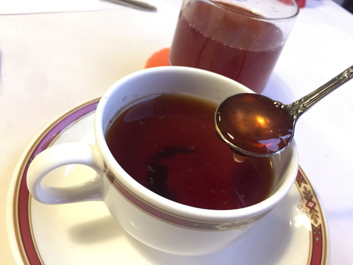 食後には、セイロンティーにオリジナルのバラの花びら入りジャムをひとさじ。「ロシアンティー」で優雅なひとときを過ごして。「ロシアンティー」の単品は400円です
