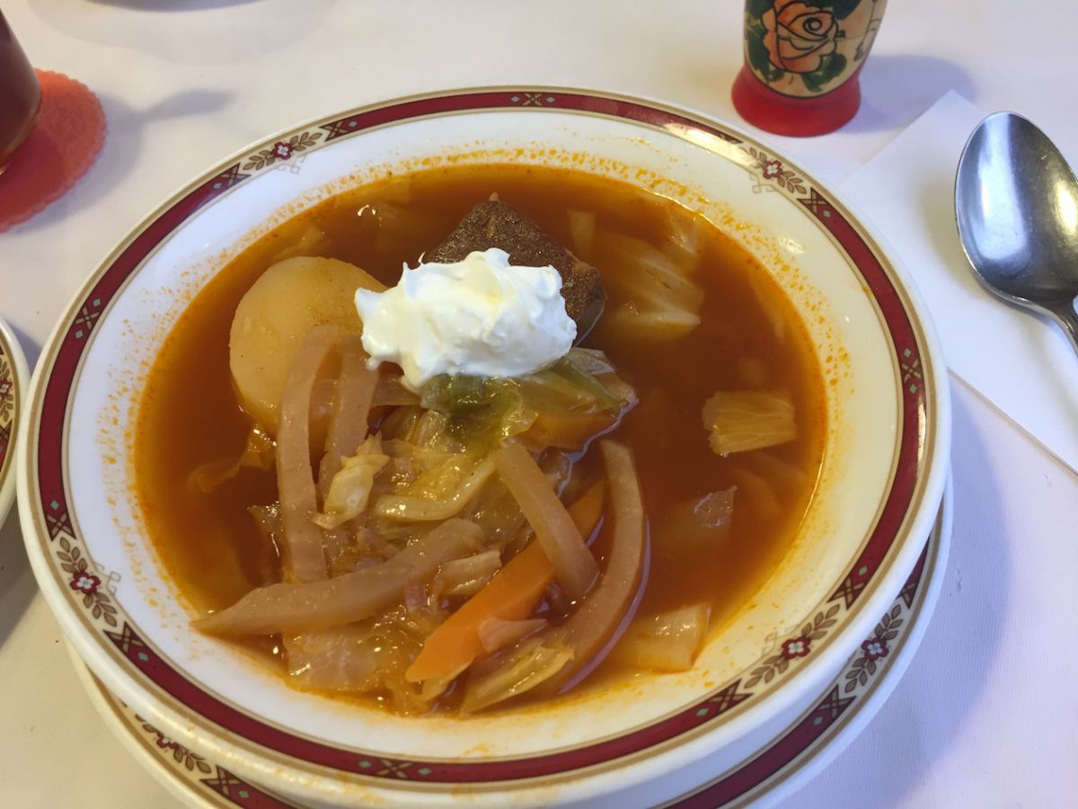 創業当時から、ずっと変わらない製法で作られ続けている「ボルシスープ」は、牛の骨から6時間かけてだしをとり、そこにキャベツ、タマネギ、ニンジン、じゃがいも、ビーツを入れて、さらに1~2時間じっくりコトコト。