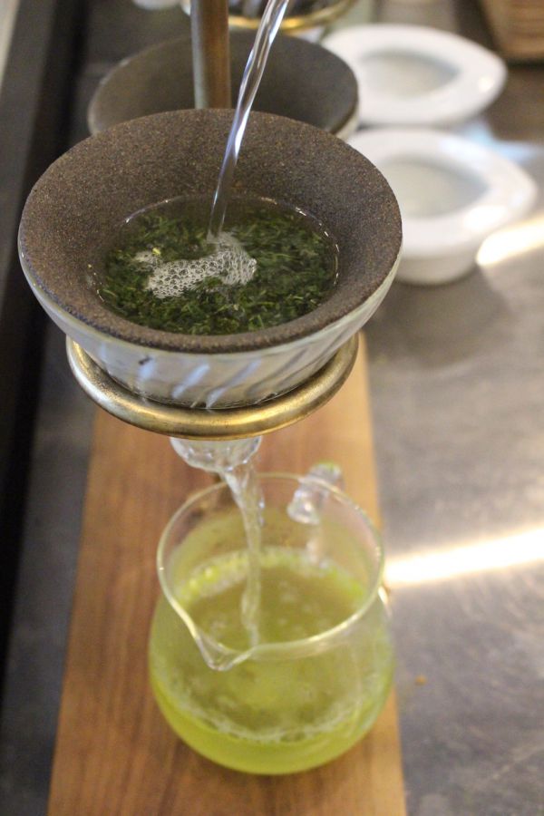 抹茶入りの緑茶はコーヒーのように1杯ずつ、手でドリップして淹れてくれます。お茶のいい香りが漂い、なんとも幸せな気分に。セラミックのフィルターを使うことで、抹茶の香りや味わいを最大限に引き出しているんだとか。茶筅でたてた本格的な抹茶も楽しめます。