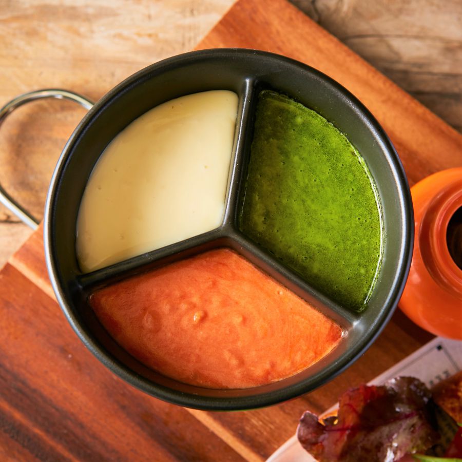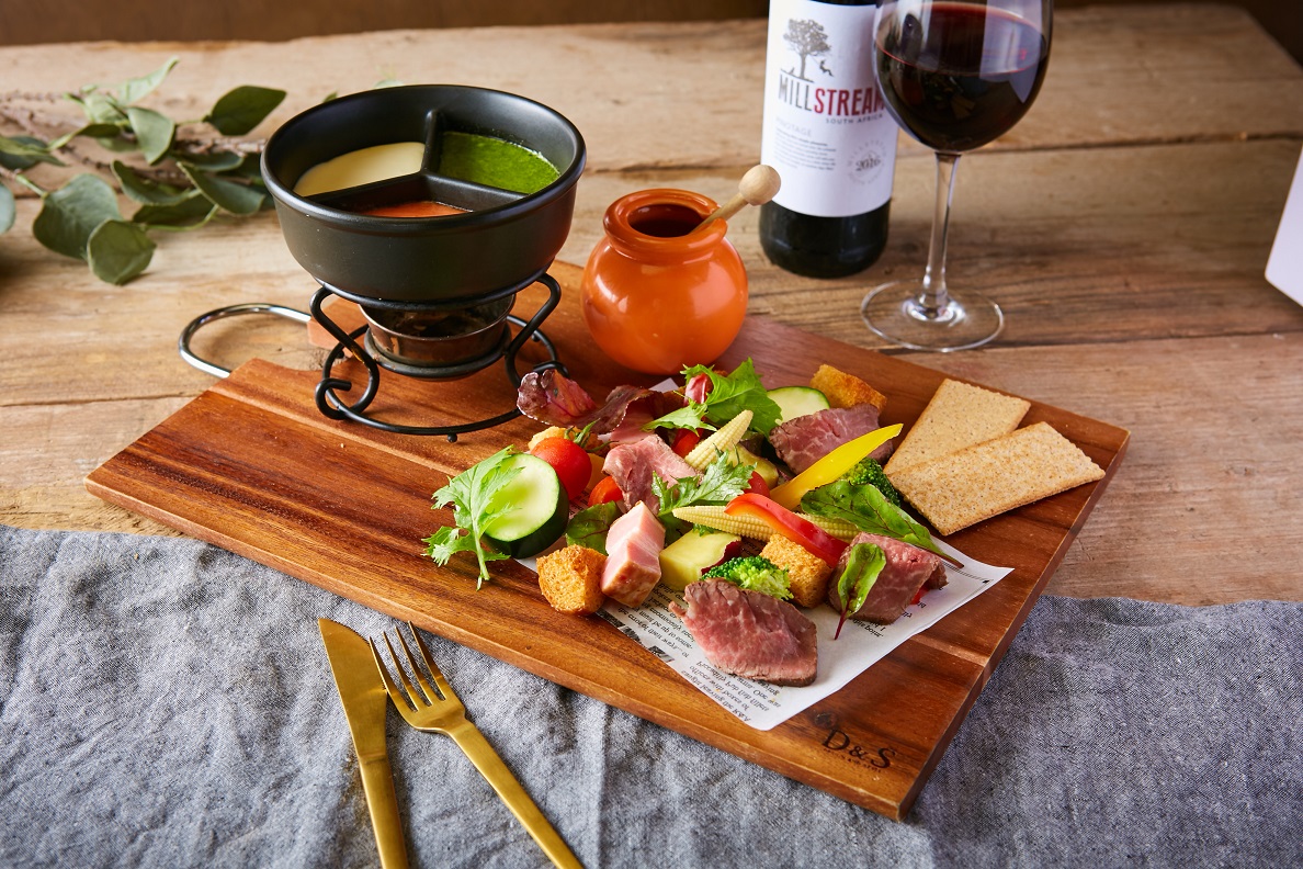 カラフルなチーズフォンデュの味は、プレーンとトマトチーズ、バジルチーズの本格的な3種類。具材のさつまいも、ズッキーニ、ブロッコリーやトマトなどの野菜と、ベーコン、ローストビーフ、すべてがなんと食べ放題。ワインとの相性もバッチリで大人なチーズフォンデュです。
