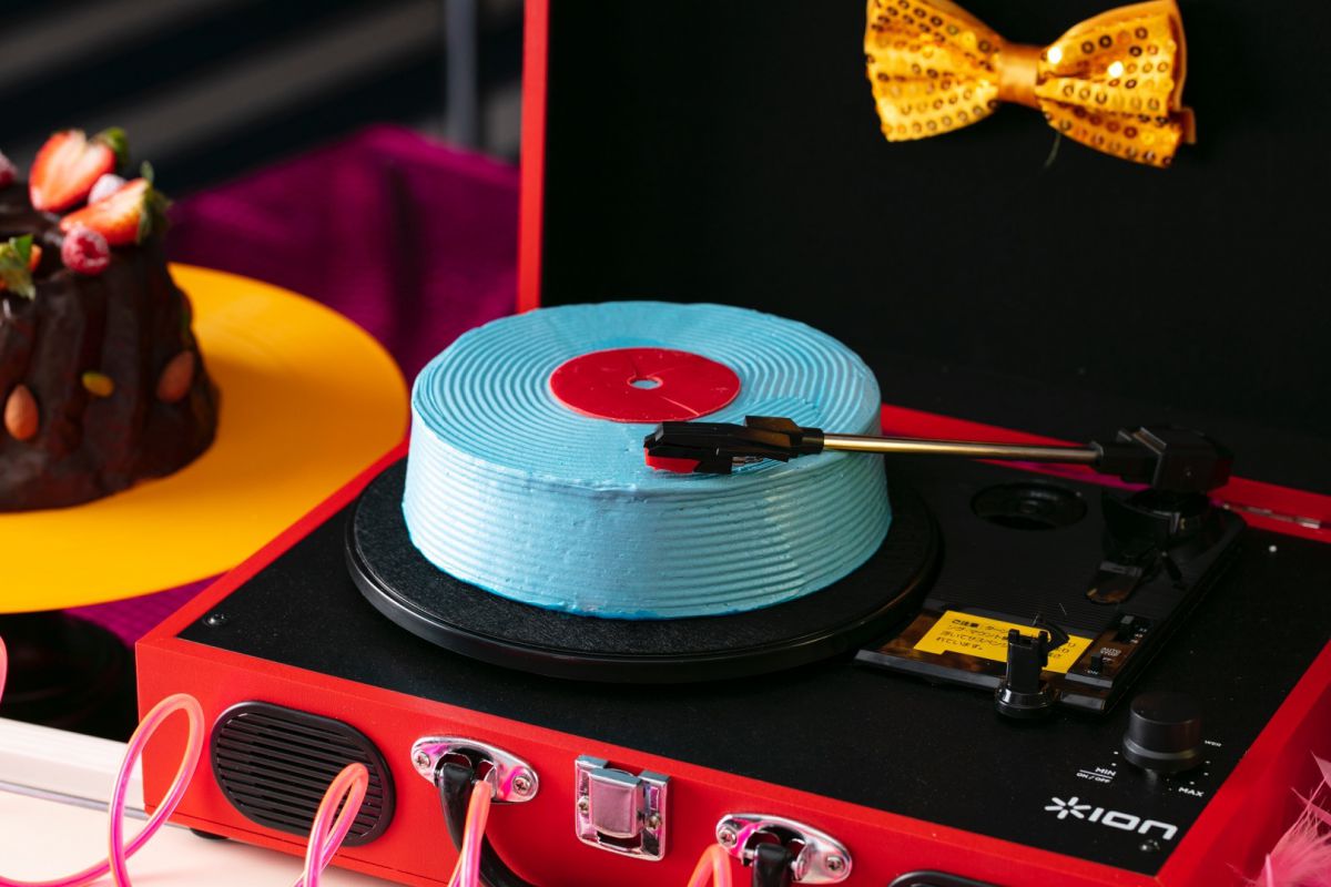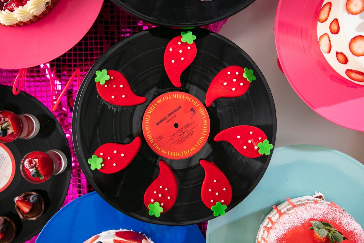 『まわるレコードにシンパシー ストロベリーミルクレープケーキ』は、フリーズドライのイチゴを入れたミルクレープをカラーレコードに。