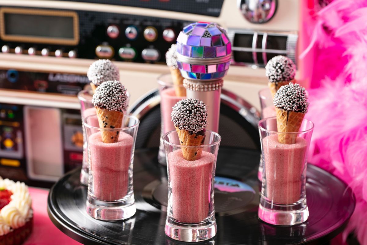 ミラーボールマイクのようなスイーツは『君とデュエット あうんのブレス ミニチョコレートマイクロフォン』。コーンの中にライスクリスピーとチョコレートガナッシュが入っているので食感が楽しめます。