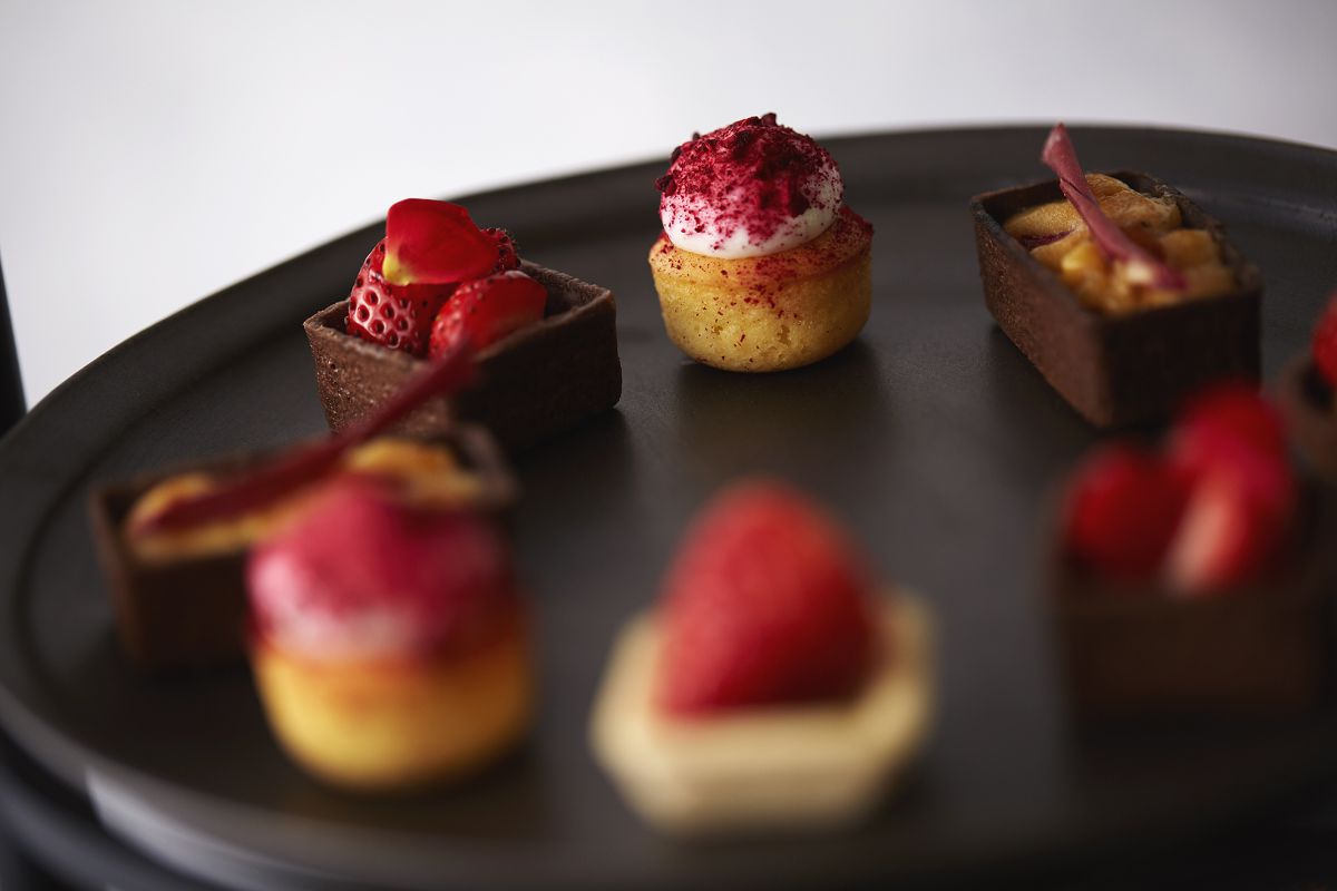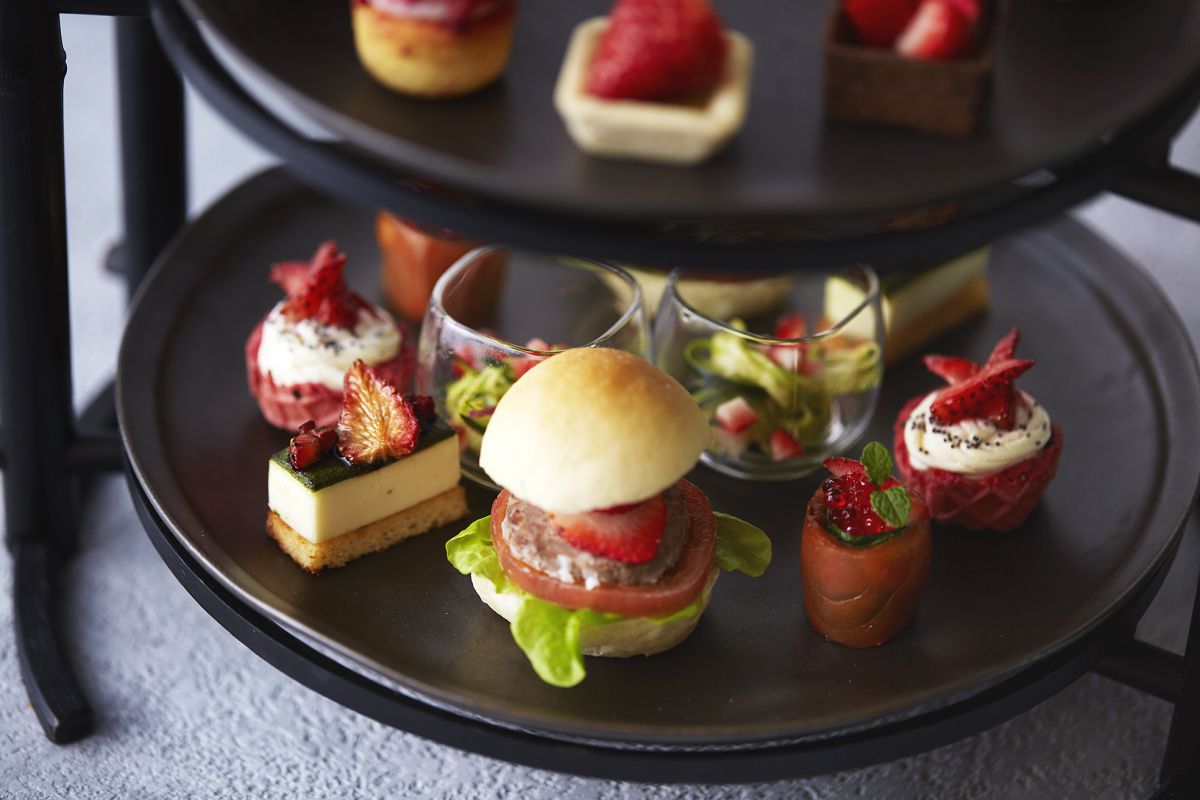 スイーツだけでなく、セイボリーも充実。トマトに見立てたいちごとモッツァレラとバジルと合わせたカプレーゼ風、濃厚なフォアグラをいちごの酸味とカリフラワームースの甘みが引き立てるタルト、ジューシーなポークとチキンのパテにいちごが絶妙なスライダーなど、いちごの風味を生かしてプレミアムな食材と合わせることで、いちごをより一層楽しめます。