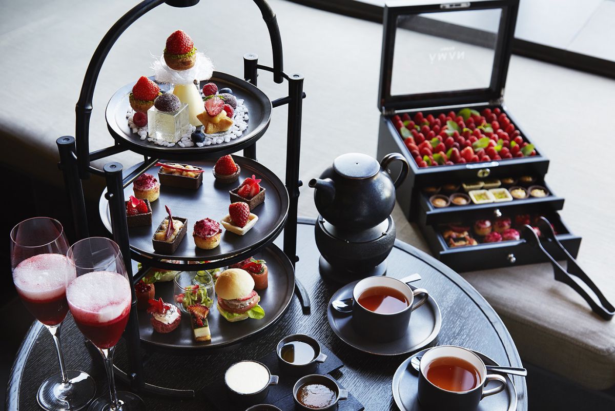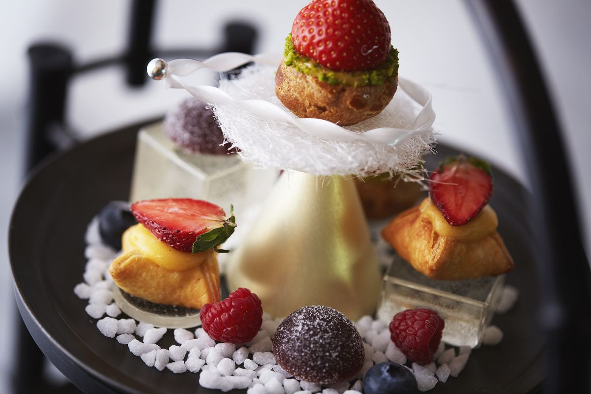 毎年大好評の春のアフタヌーンティー。今年はアマン東京特製のジュエリーボックスで登場。シャンパングラスには、ミックスベリーのスープを注ぎ、仕上げにシャンパンのエスプーマを添えたスペシャルなドリンク。アマン東京オリジナルのスタイリッシュな黒竹三段トレーもおしゃれ。