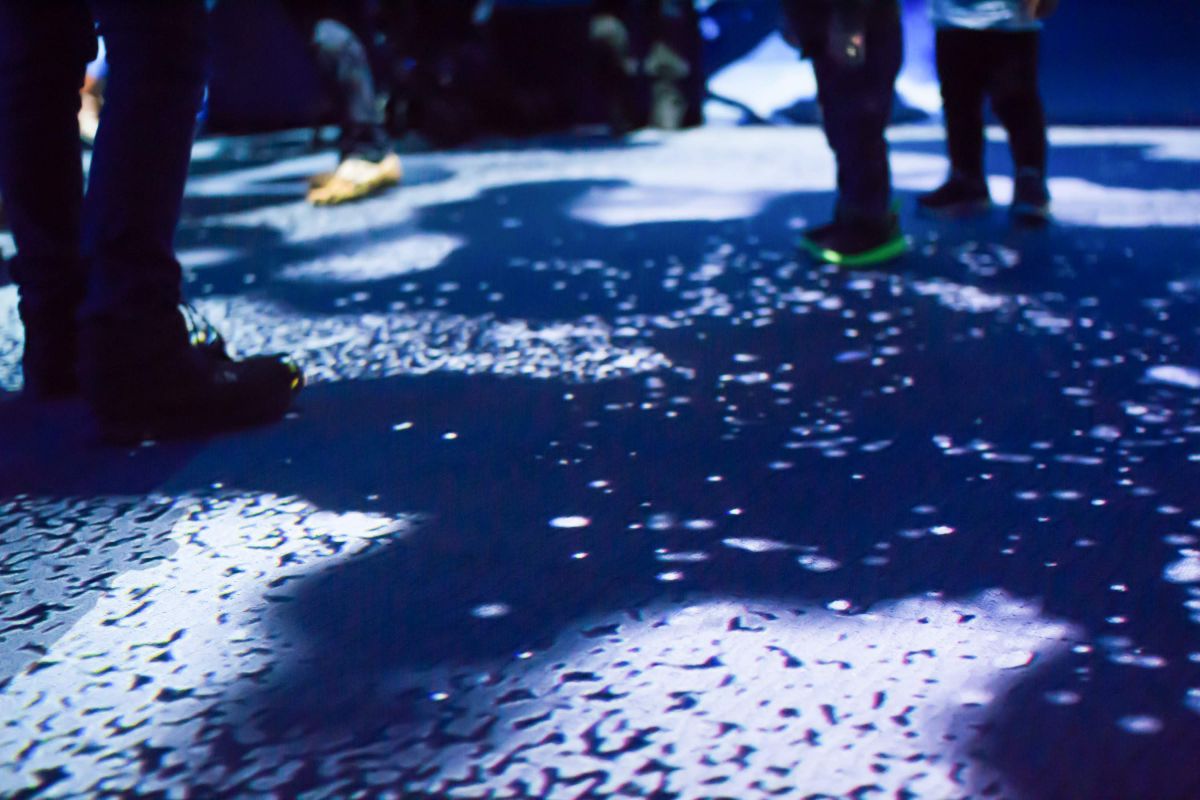 降り積もった雪の上を実際に歩いたかのように足跡がついたり、映し出された水の上を歩くと足跡が波紋になって広がったり。人の動きに合わせて映像が変化するインタラクティブな演出を、見るだけではなく体感できます。