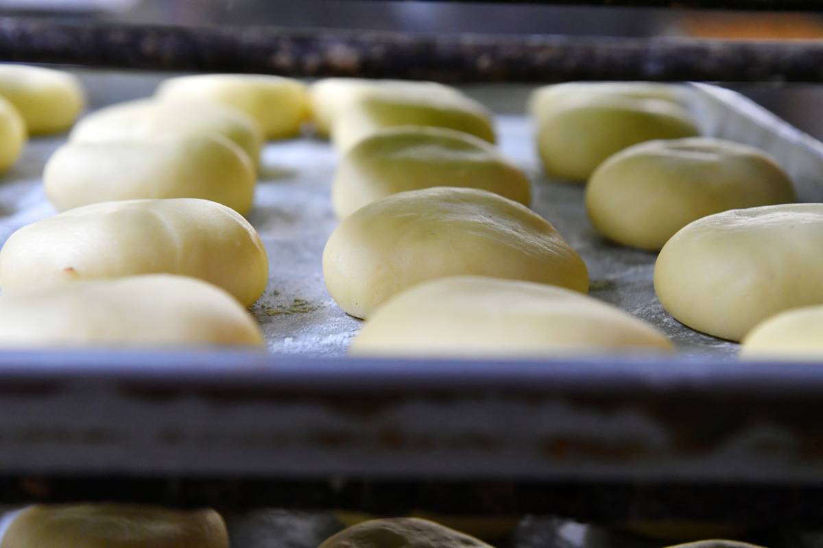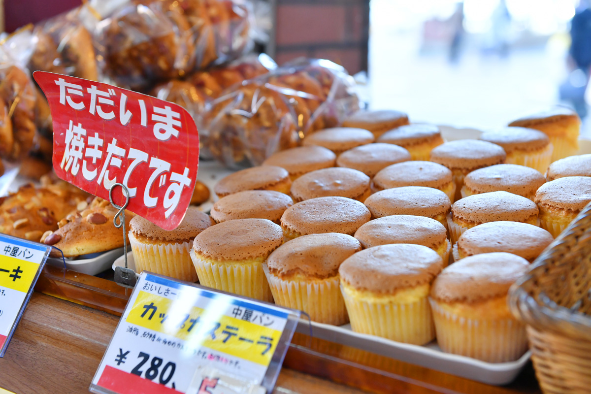 中屋パンでは“どこにでもあるけど、どこよりもおいしい”をモットーに、菓子パンから惣菜パンまで100種類以上のパンを毎日焼き上げます。開店と同時にたくさんの客…、その多くは常連で引きも切らず訪れて次々とパンが売れていく様子は圧巻。厨房では商品を切らさないよう、パンの生地作りを店主の平井さんが担い、スタッフさんとともに休みなく次々とパンを焼き上げていきます。「ただいま焼きたてです」の札が付いたパンが、どの時間に訪れてもいくつかありますよ。