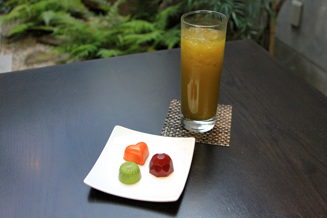写真のショコラは和栗(右)、青梅(左)、五島の塩(奥)。どのフレーバーもひと口目からふんわりと風味が広がり、飽きのこない味わいに仕上がっています。抹茶を炭酸で割った抹茶ソーダ400円と一緒に味わえば、いくつでも食べられそう。