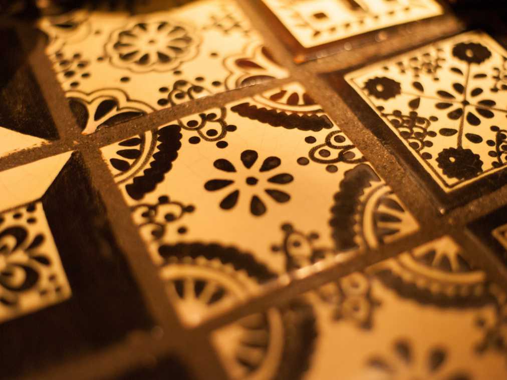 店内に設置されているアンティーク調のインテリアも、見逃すことができません。例えば、しっかりとした造りの重厚感あるテーブル。テーブルの表面を覆うタイルには、さまざまなモチーフがプリントされています。