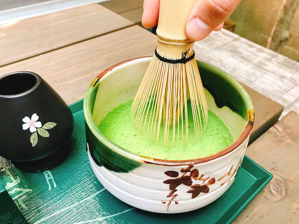 抹茶が入った茶碗にお湯を注いで、茶せんを縦方向に動かしシャカシャカ点てると…緑色の繊細な泡に。抹茶を口に含むとふわりと奥深い香りに包まれて、ほっこりした気分になれます。