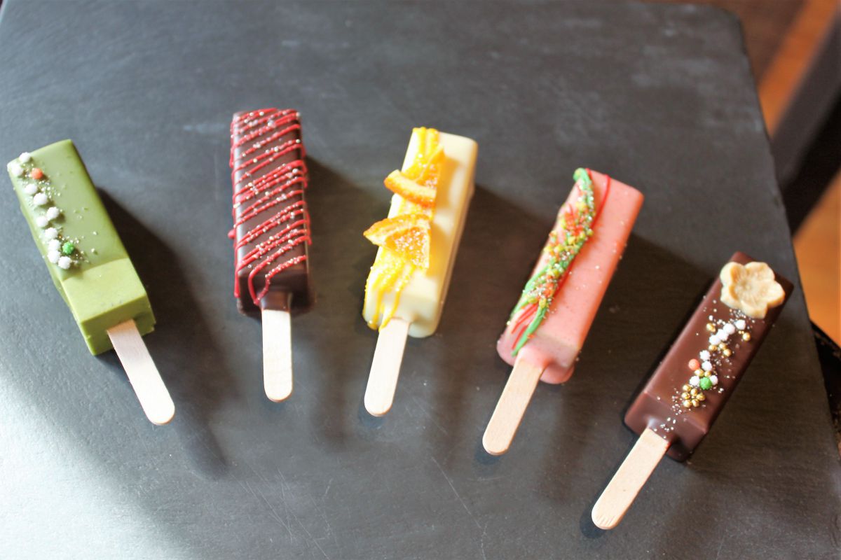 これを求めて遠方からやってくるチョコフリークも多い「スティックショコラ」は、やさしい口どけの棒付きチョコレート。コーンフレークやあられ、ナッツ入りの「ベーシック」、キャラメルソース入りの「センターキャラメル」、まるでケーキみたいな「パティスリー」。