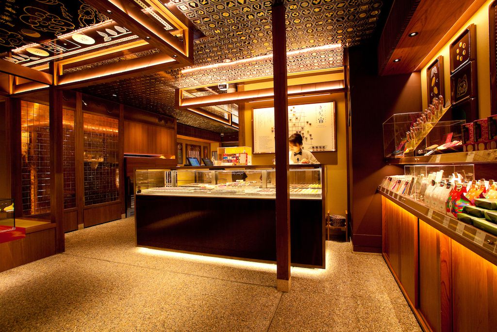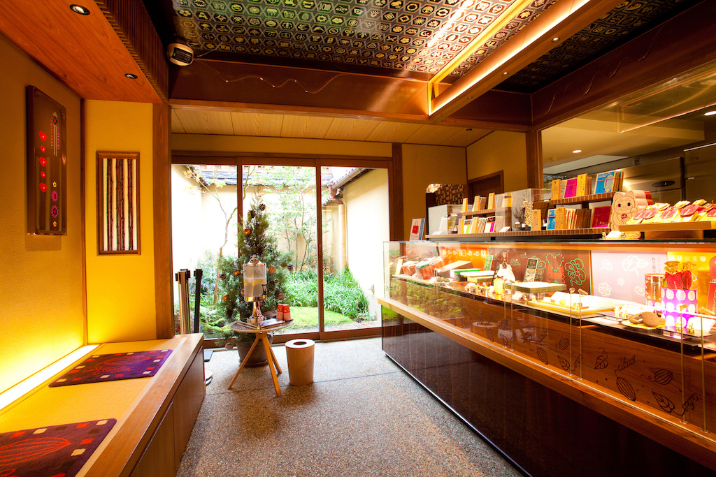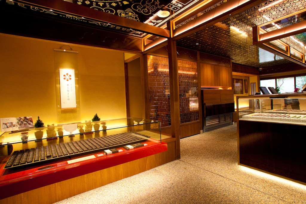 商品がずらりと並ぶショーケース。奥の坪庭からの自然光が、神々しい雰囲気を和らげています。