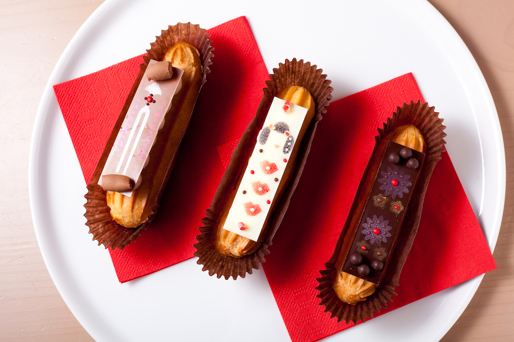 「加加阿365」には、京都らしさをエッセンスにした商品もあります。そのひとつが舞妓さんのおちょぼ口でも食べられるように作られた、「ちょこっとエクレア」。サクッとしたエクレア生地に、3種の違う味のチョコクリームがたっぷり。